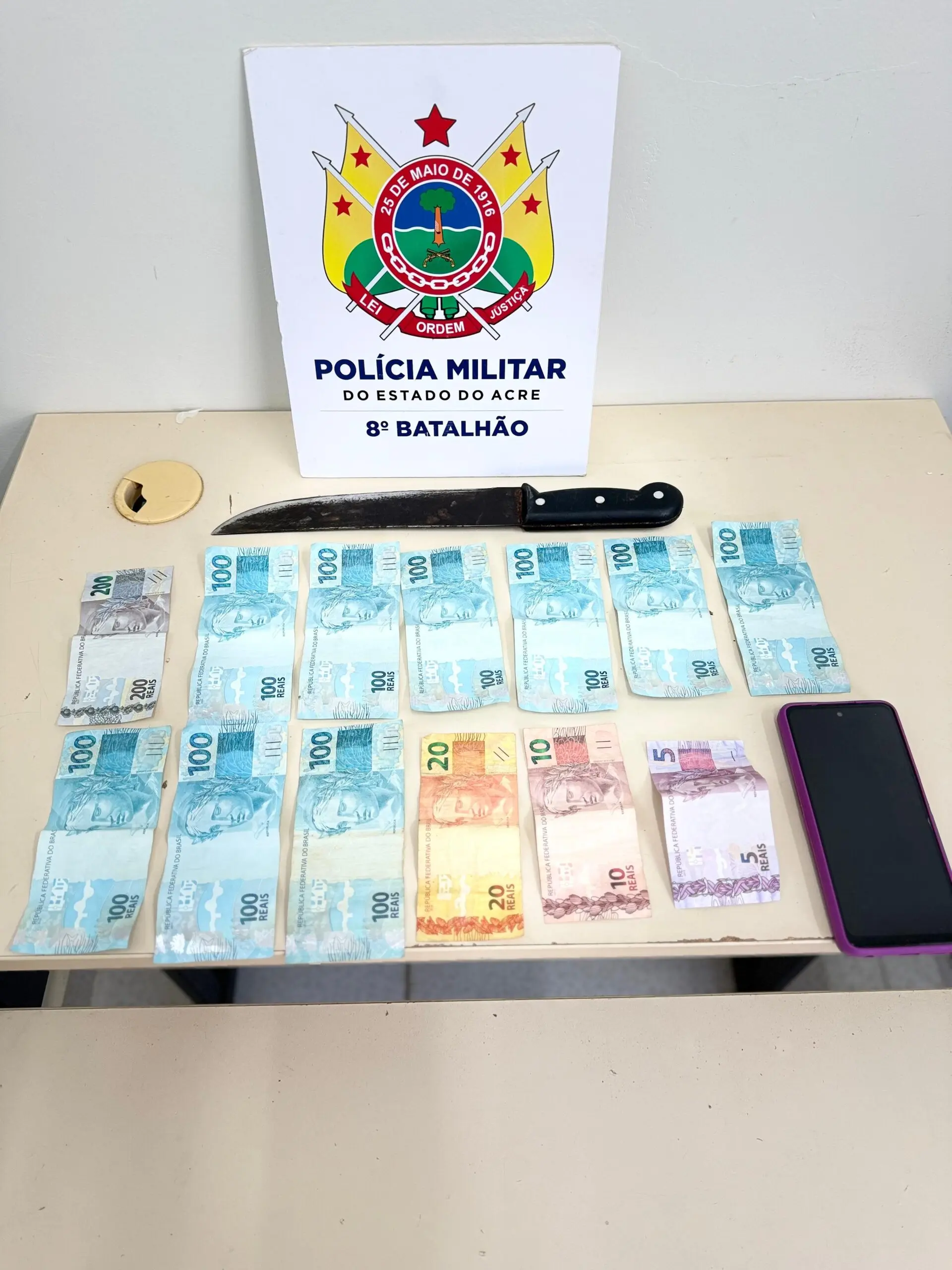 Armado com um facão, o infrator abordou um grupo de pessoas e se apossou do dinheiro e do celular, fugindo em seguida. A PM foi acionada e após diligências, obteve êxito na ação.