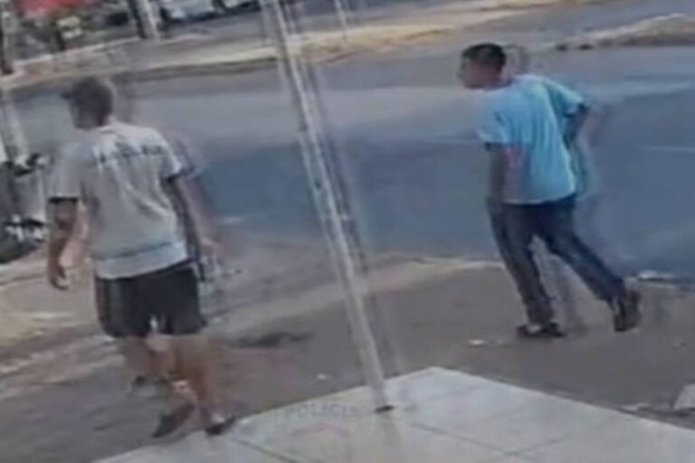 • Pelas imagens, é possível ver quando os agressores – um deles com uma faca em mãos – aproximam-se da vítima.