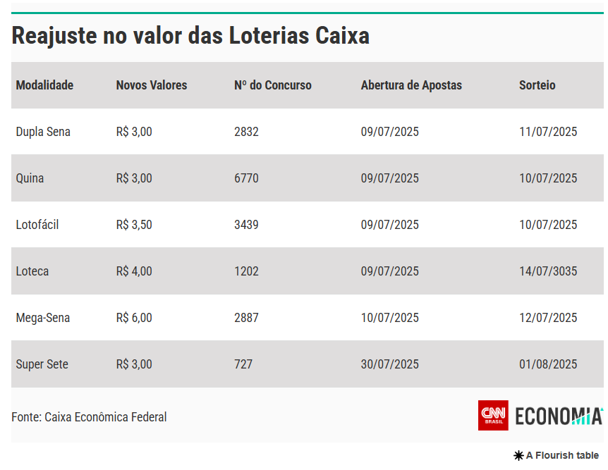 As apostas das Loterias Caixa aumentam a partir de 9 de julho. O reajuste atinge as modalidades Dupla Sena, Quina, Lotofácil, Mega-Sena, Loteca e Super Sete.