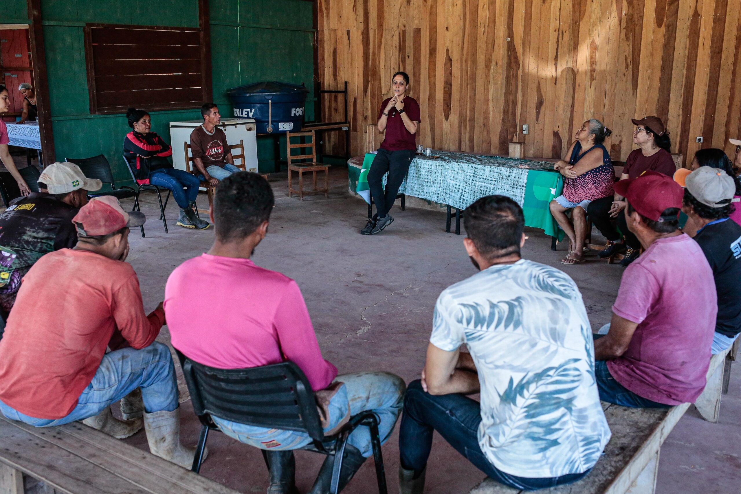 A oficina foi iniciada com um diálogo sobre a relevância da atividade, que envolve o resgate de referências culturais do território tradicional seringueiro e objetiva a transmissão de conhecimentos tradicionais entre gerações. As técnicas de construção, o adjunto (mutirão) e a própria Casa são exemplos de referências culturais. A segunda parte da oficina contou com atividade na mata, com identificação das espécies e ensinamentos de como manejá-las para um melhor resultado.