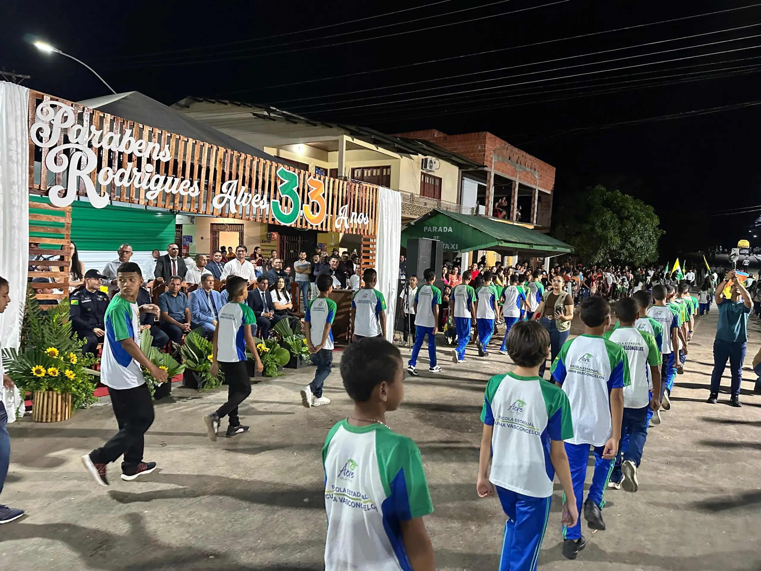 Na noite desta segunda-feira (28), o município de Rodrigues Alves viveu um momento marcante em sua história com a realização do desfile cívico-militar em celebração aos 33 anos de emancipação política. O evento, considerado um dos mais especiais da programação, reuniu autoridades, estudantes, militares e a população local em clima de festa e patriotismo.