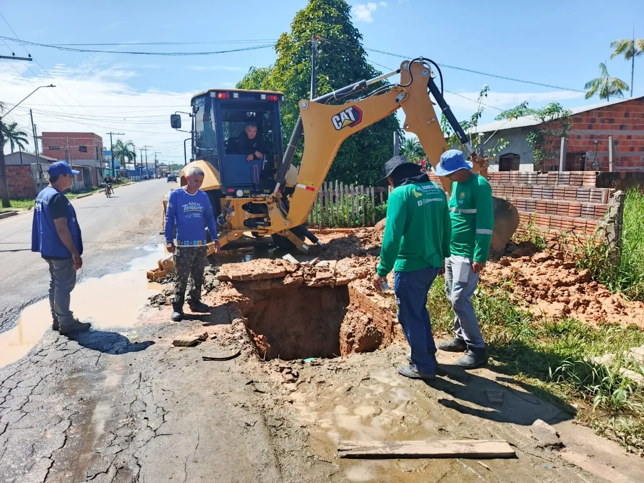Nesta terça-feira (8), equipes atuam no Bairro Miritizal, em frente à sede da Prefeitura. Foto: Ascom