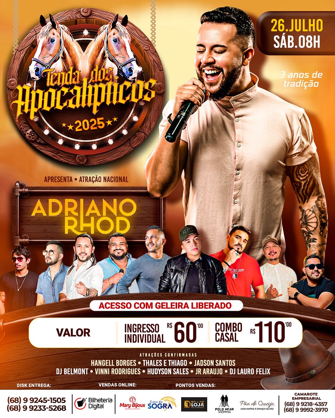 Entre as atrações, o destaque é o show nacional de Adriano Rhod, a nova revelação do sertanejo, autor do hit “Duas Três”, sucesso gravado em parceria com Ana Castela e a dupla Guilherme & Benuto. Além dele, sobem ao palco Hangel Borges, Vinni Rodrigues, Thales e Thiago, Jadson Santos, Hudyson Sales e Jr Araújo, além dos DJs Belmont e Lauro Félix, garantindo a animação durante 10 horas ininterruptas de festa.