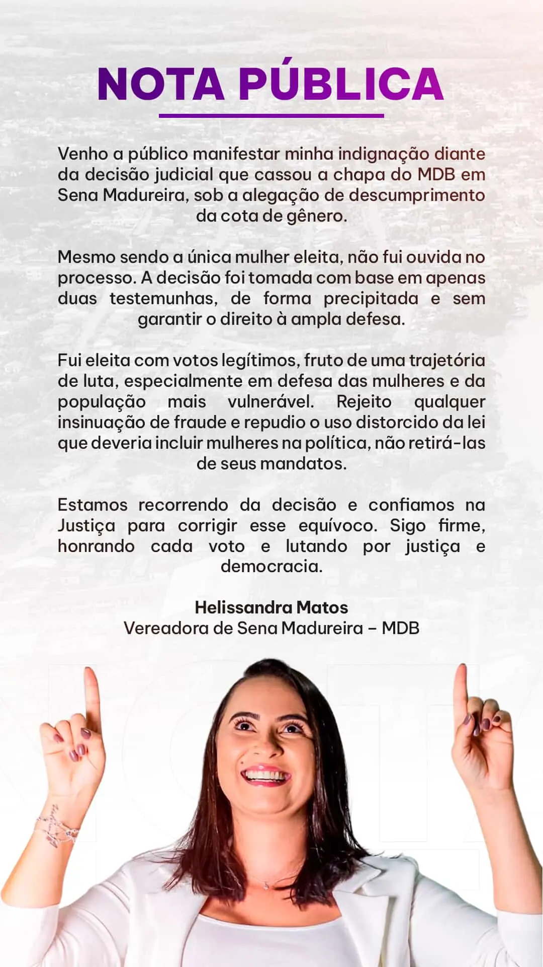 A vereadora Helissandra Matos (MDB), de Sena Madureira, se manifestou neste domingo (6) contra a decisão da Justiça Eleitoral que anulou a chapa proporcional do MDB no município por suposta fraude na cota de gênero nas eleições de 2024. A sentença, assinada pelo juiz Éder Jacoboski Viegas, aponta o uso de candidaturas femininas fictícias para cumprir formalmente a exigência legal de 30% de mulheres nas eleições proporcionais.