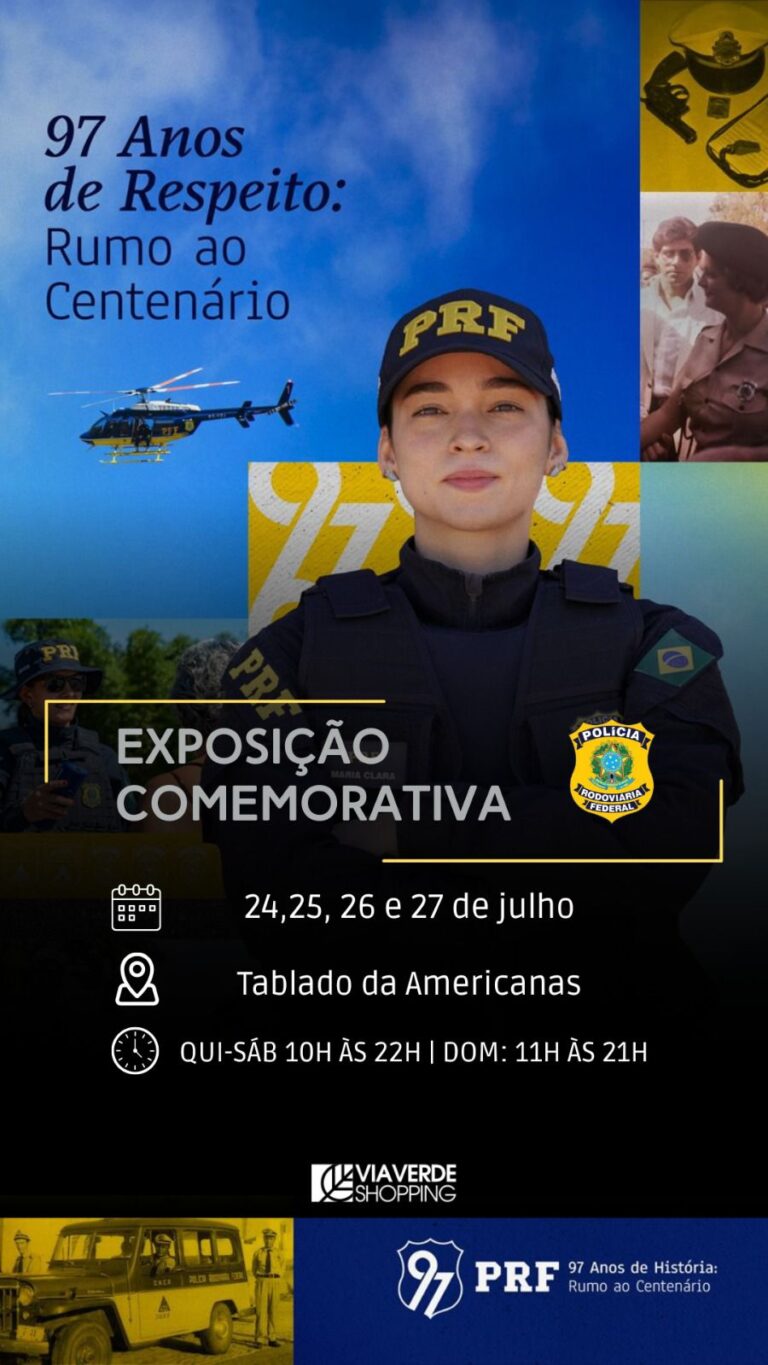 Entre os dias 24 e 27 de julho, o Via Verde Shopping recebe a exposição em comemoração aos 97 anos da Polícia Rodoviária Federal (PRF). Durante o evento, o público poderá conhecer de perto o trabalho desenvolvido pela instituição, visitar viaturas, interagir com os agentes e participar de atividades educativas e lúdicas, especialmente voltadas para crianças e famílias.