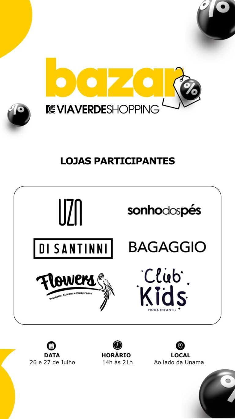 Lojas como Bagaggio, Di Santinni, Uza, Sonho dos Pés, Flowers e ClubKids participam do bazar com uma curadoria exclusiva de itens nos segmentos de calçados, acessórios, moda infantil e artigos de decoração. A proposta é oferecer ainda mais oportunidades para o público aproveitar descontos diferenciados em um só lugar, reforçando o Via Verde Shopping como um dos principais polos de compras da capital.