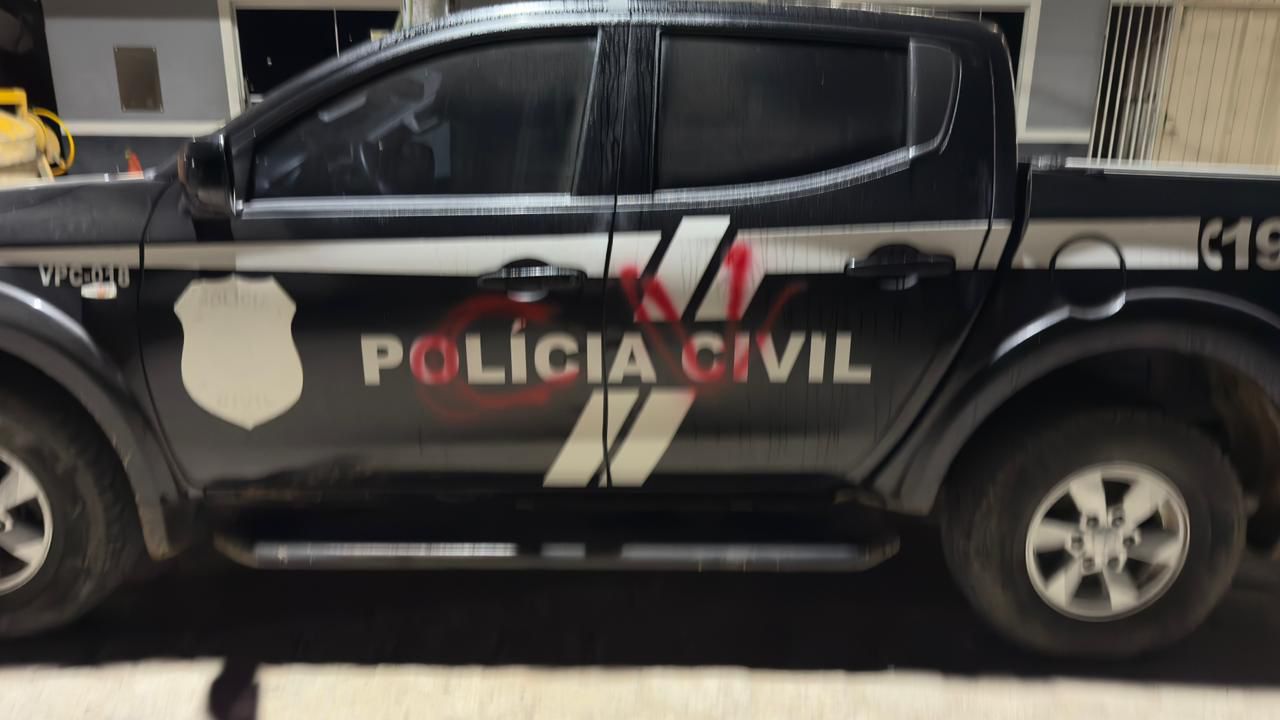 Viatura é da Polícia Civil é pichada com sigla de facção criminosa no interior do Acre/Foto: Reprodução