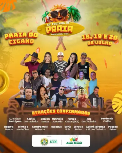 A tradicional Praia do Cigano, em Assis Brasil (AC), será palco do 19º Festival de Praia, que acontece nos dias 18, 19 e 20 de julho, prometendo muita música, diversão e integração cultural na tríplice fronteira.