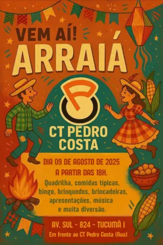 Após o enorme sucesso do ano passado, o Arraiá CT Pedro Costa retorna com tudo para sua 3ª edição, prometendo uma festança ainda maior, mais animada e cheia de surpresas para a comunidade.