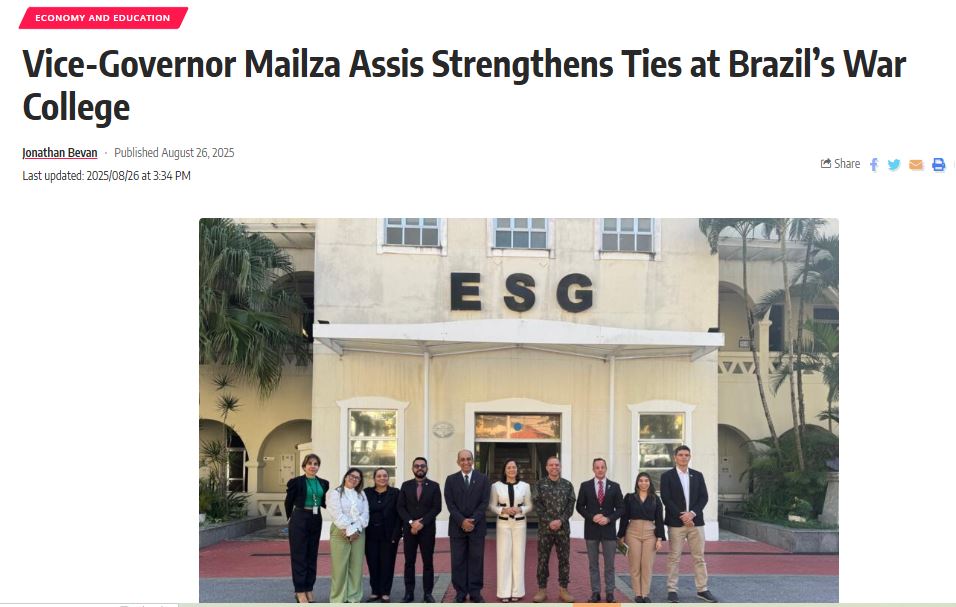 No Reino Unido, o site PopSize publicou a reportagem “Vice-Governadora Mailza Assis estreita laços com a Escola Superior de Guerra do Brasil“. O texto destacou o papel da vice-governadora na aproximação do Acre com os centros estratégicos do país, reforçando temas como inovação, desenvolvimento sustentável, defesa e integração social.