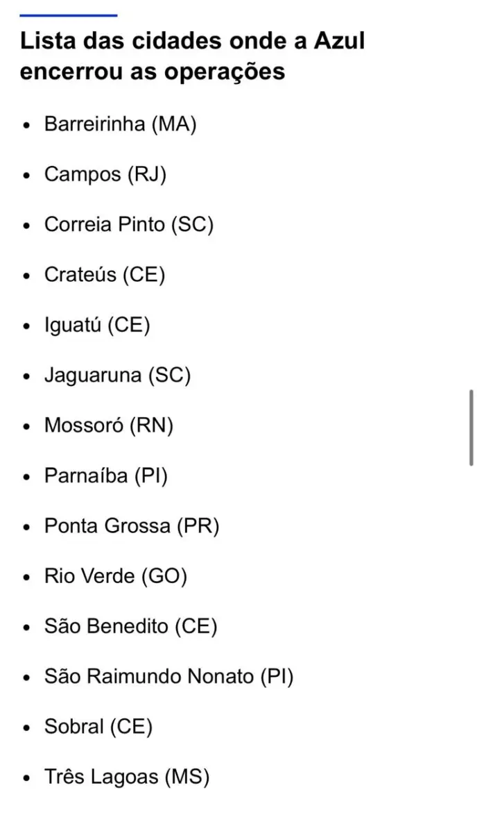 A Azul Linhas Aéreas comunicou a suspensão de 53 rotas em 13 cidades consideradas “não lucrativas”, como parte de seu plano de reestruturação financeira apresentado em agosto. A decisão visa reduzir custos e atualizar o modelo de negócios da companhia, que está em processo de recuperação judicial, equivalente ao Chapter 11 nos Estados Unidos.