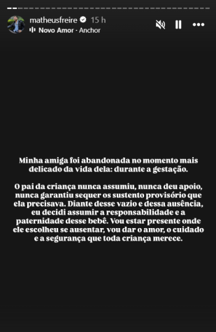 Diante dessa situação, o influenciador Matheus Freire, 29 anos, conhecido por sua participação no reality De Férias com o Ex: Caribe VIP 4, anunciou nesta terça-feira (26) que decidiu assumir a paternidade de Luan Ravi. “Minha amiga foi abandonada no momento mais delicado da vida dela: durante a gestação. O pai da criança nunca assumiu, nunca deu apoio, nunca garantiu sequer o sustento provisório que ela precisava. Diante desse vazio e dessa ausência, eu decidi assumir a responsabilidade e a paternidade desse bebê. Vou estar presente onde ele escolheu se ausentar, vou dar o amor, o cuidado e a segurança que toda criança merece”, escreveu em suas redes sociais.