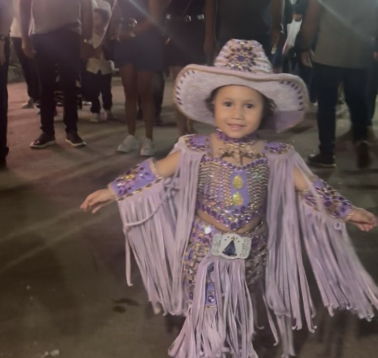 Uma boiadeira mirim chamada Jade Helena roubou a cena durante a ExpoAcre 2025. Vestida com um look roxo completo — incluindo chapéu, camisa bordada e calça personalizada —, a pequena chamou atenção ao desfilar com segurança e estilo pelo parque de exposições.