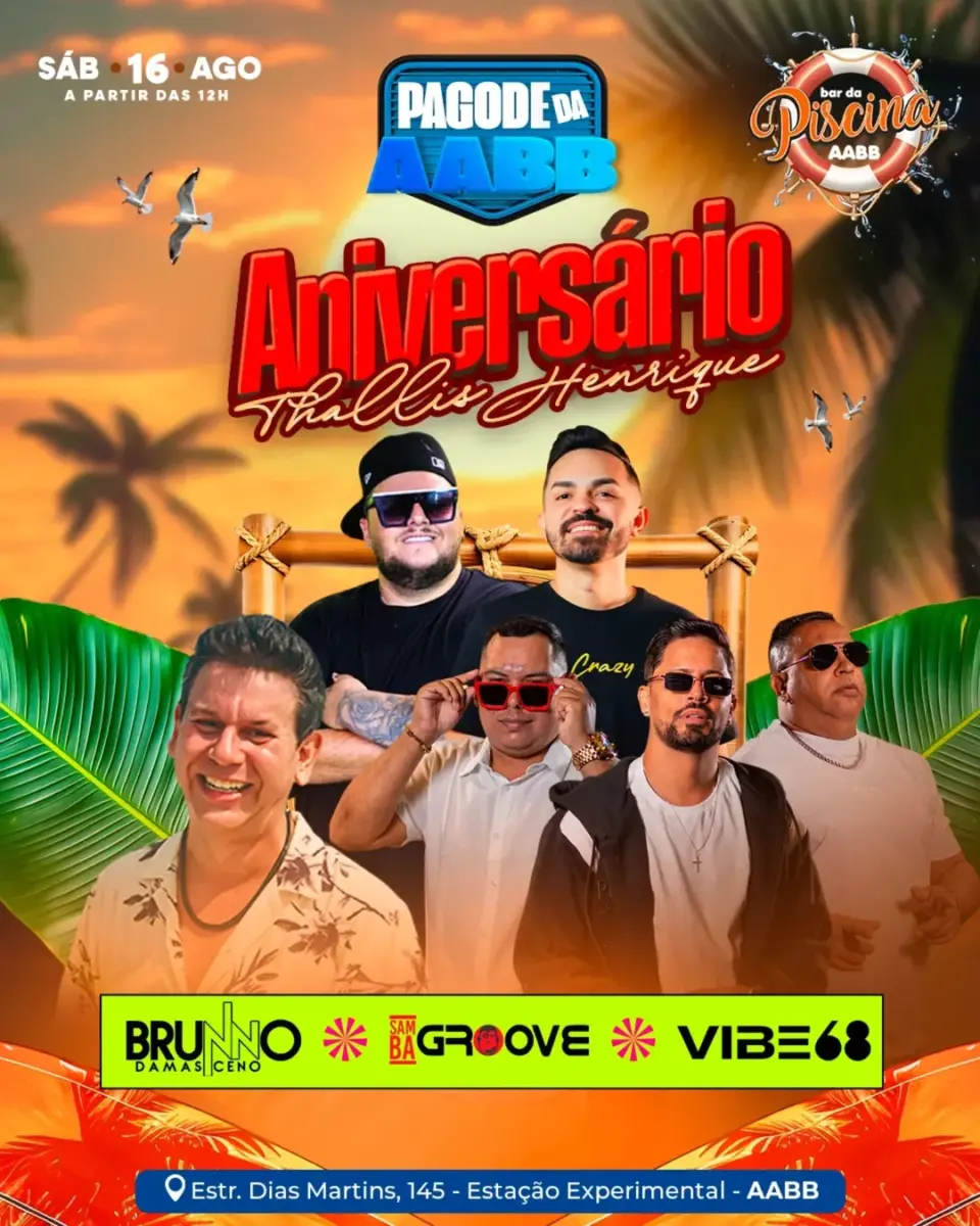 Bar Piscina da AABB abre as portas para o Aniversário do Thallis Henrique com Pagode da AABB, Brunno Damasceno, Samba Groove e Vibe 68. Música boa e clima de festa garantidos.