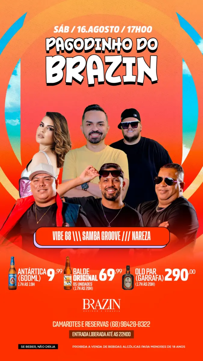 O Brazin tem pagodinho a partir das 17h. Se prepara para sambar, rir e até arriscar uns passos duvidosos que vão virar história.