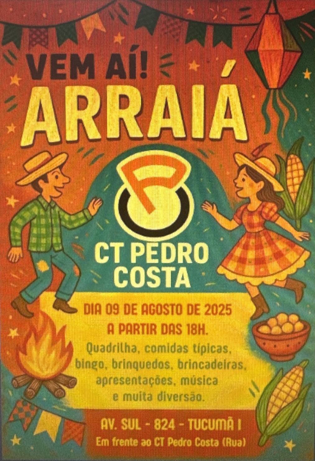 Prepare o traje xadrez, o chapéu de palha e o coração pra se divertir, porque o Arraiá mais animado fora de época, acontece neste sábado, 9, às 18h, na Av. Sul, 824, Tucumã I, em frente ao CT Pedro Costa.