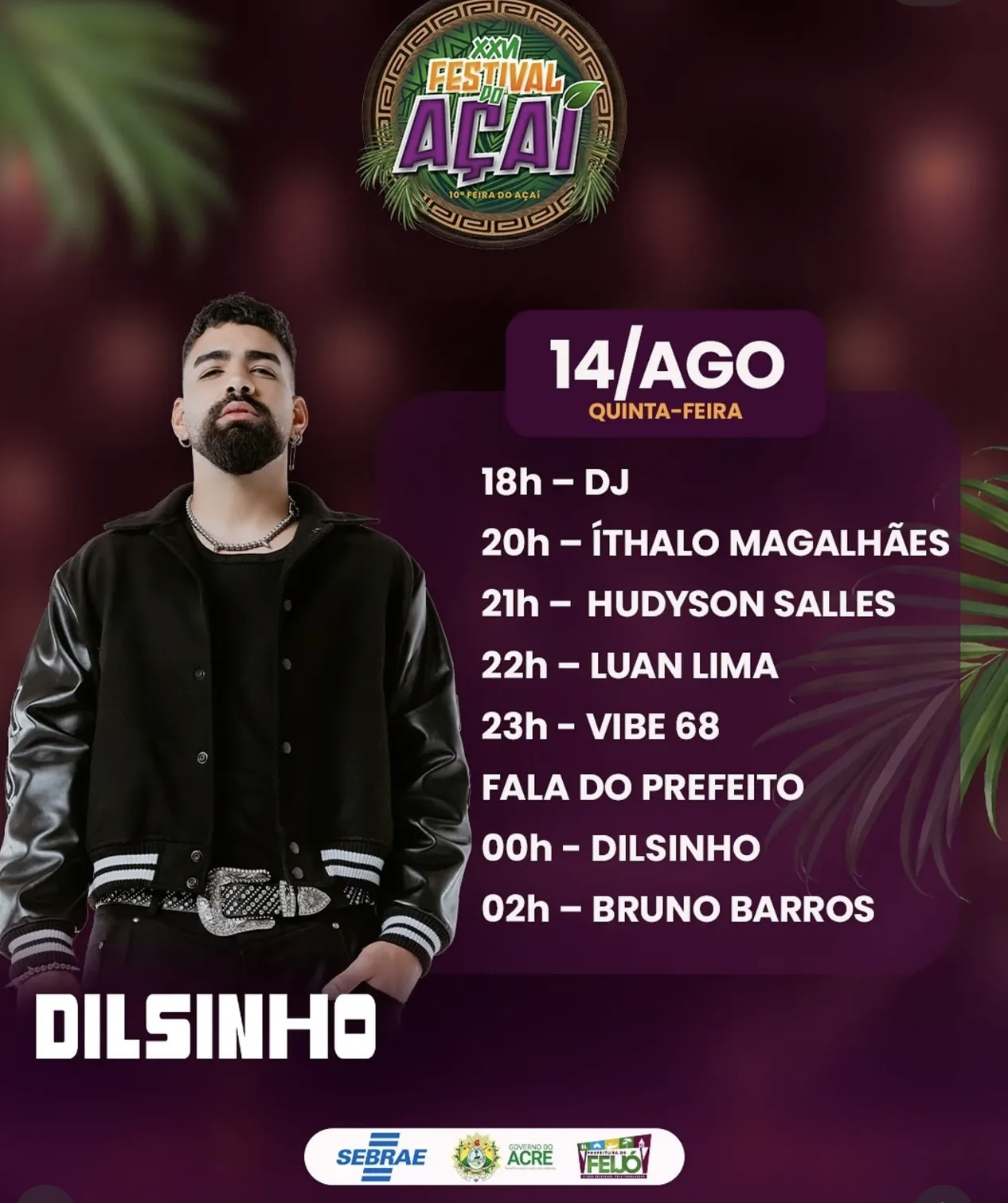 #Mas a cereja do bolo, ou melhor, a polpa do açaí, chega à meia-noite, com o show nacional de Dilsinho, que vai embalar corações apaixonados com seus sucessos românticos e aquele pagode que a gente ama cantar em coro. Pra fechar a noite em alto estilo, Bruno Barros assume o som às 2h da madrugada.