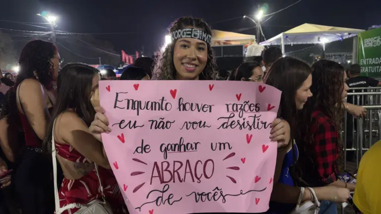 Com cartazes, fãs gritam por abertura dos portões no show de Jorge e Mateus na Expoacre 2025. Foto: ContilNet