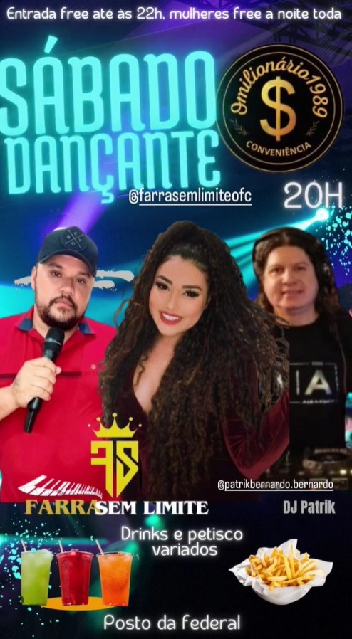 O Milionário, que fica lá no posto da federal, vai ter o Sábado Dançante com Farra sem Limite e DJ Patrik: prepare o tênis, porque aqui não tem hora pra parar.