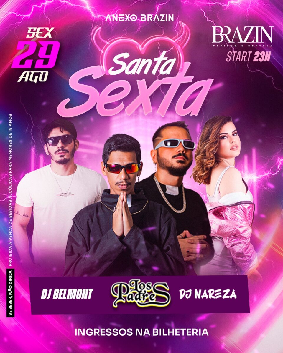 Ali do lado, no Anexo Brazin, vai ter uma noite pra rapaziada crente, com a Santa Sexta comandada pelos Los Padres: a benção vem, mas já sabe né? Ajoelhou tem que rezar!