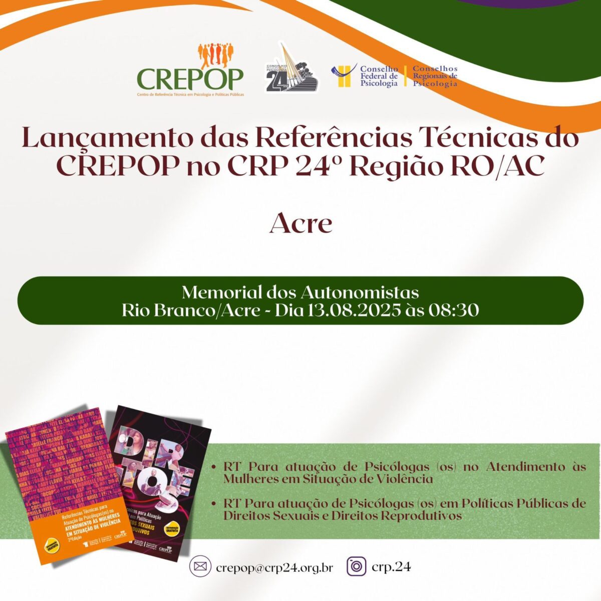 O Conselho Regional de Psicologia da 24ª Região – Acre (CRP-24) lança nesta quarta-feira (13), em Rio Branco, duas novas Referências Técnicas elaboradas pelo Conselho Federal de Psicologia (CFP) em parceria com os CREPOPs regionais. O evento ocorre às 8h30, no Memorial dos Autonomistas, e integra a programação do Agosto Lilás, mês de conscientização e combate a violência contra a mulher.