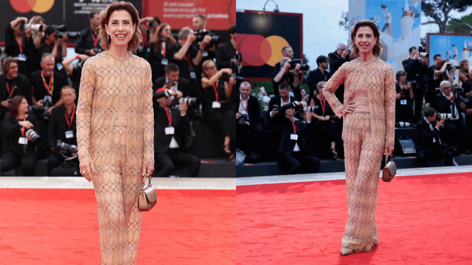 A atriz Fernanda Torres marcou presença no Festival de Cinema de Veneza, na Itália, onde atua como integrante do júri. No tapete vermelho desta quarta-feira (27/8), a artista inovou ao deixar de lado os tradicionais vestidos longos e escolher um conjunto de blusa e calça coberto de brilhos, com linhas retas, da coleção primavera-verão 2025 da Armani Privé.