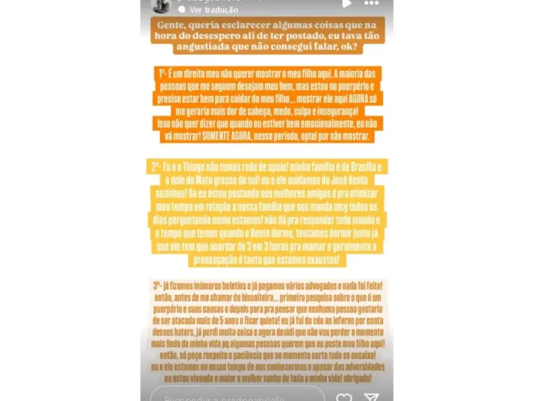 “É um direito meu eu não querer mostrar meu filho aqui. A maioria das pessoas que me seguem desejam meu bem, mas estou no puerpério é preciso estar em paz para cuidar do meu filho… mostrar ele aqui agora só me geraria mais dor de cabeça, medo, culpa e insegurança!… Somente agora, nesse período, optei por não postar”, esclareceu.