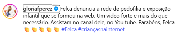 Em seu post, Gloria destacou a importância do trabalho de Felca, classificando o conteúdo como “forte e mais do que necessário”. Ela incentivou seus seguidores a assistirem ao vídeo no canal do YouTube do influenciador e parabenizou o jovem pelo empenho em expor uma realidade tão grave.