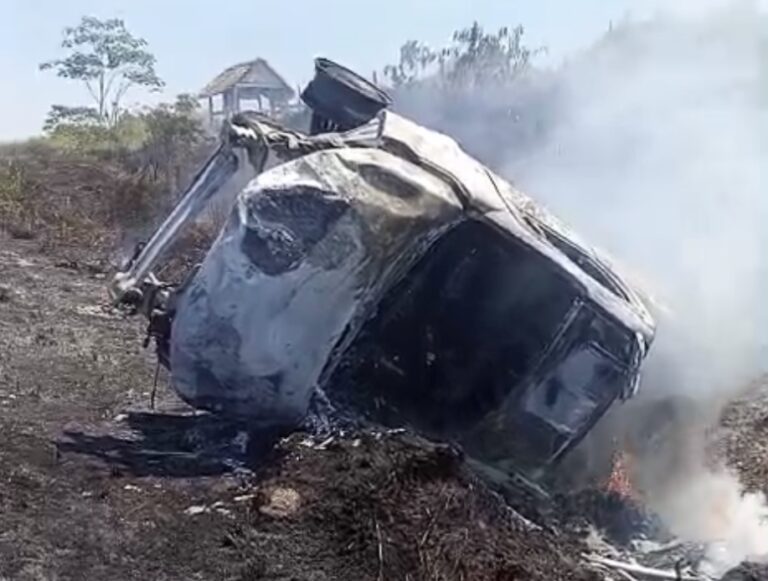 Homem capota carro após bater em buraco e veículo pega fogo em rodovia no interior do Acre. Foto: Reprodução