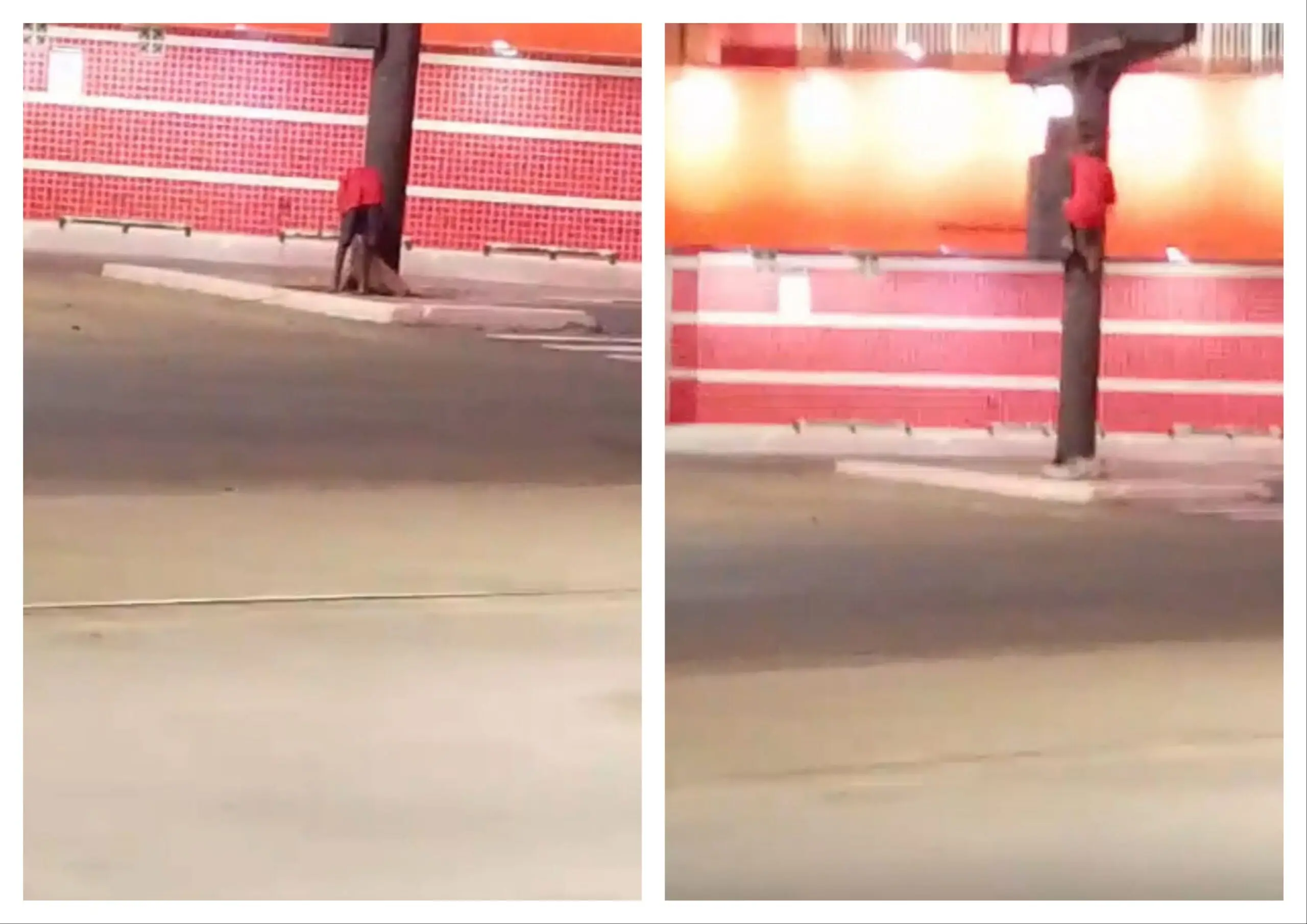 Nas imagens, o suspeito, vestindo camisa vermelha, sobe no painel, retira os fios e deixa o local carregando o material.