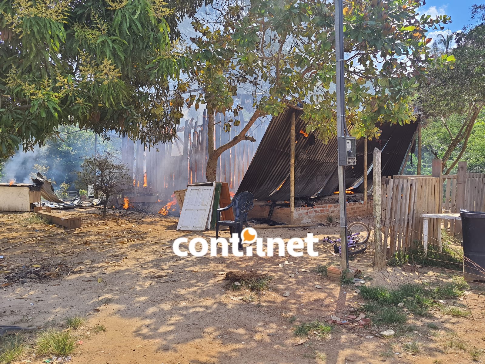 Uma casa de madeira foi completamente destruída por um incêndio na manhã desta segunda-feira (4), no bairro José Hassem, em Epitaciolândia, cidade acreana que faz fronteira com a Bolívia. A moradora, Luanara Moreira de Almeida, de 28 anos, conseguiu sair do imóvel com os três filhos pequenos sem sofrer ferimentos.