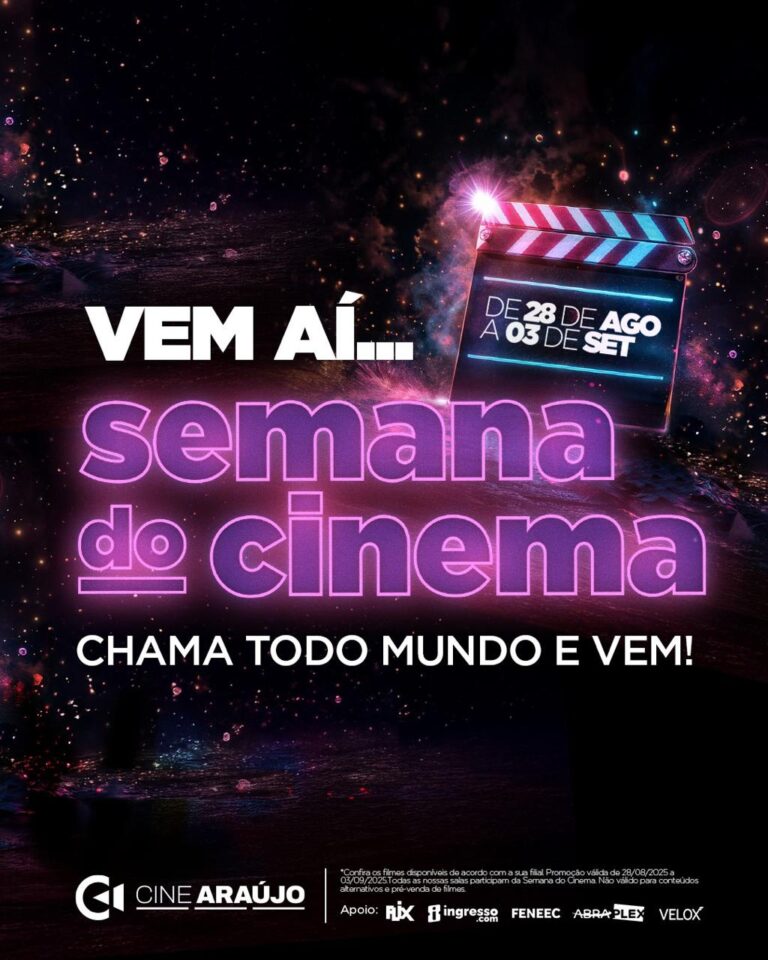 A Semana do Cinema está de volta às salas do Cine Araújo no Via Verde Shopping, de 28 de agosto a 3 de setembro, oferecendo ingressos a preços especiais que aproximam o público das salas. Durante sete dias, é possível conferir filmes para todos os estilos, aproveitando condições promocionais tanto nas sessões convencionais quanto nas salas VIP, que também recebem um valor super especial.