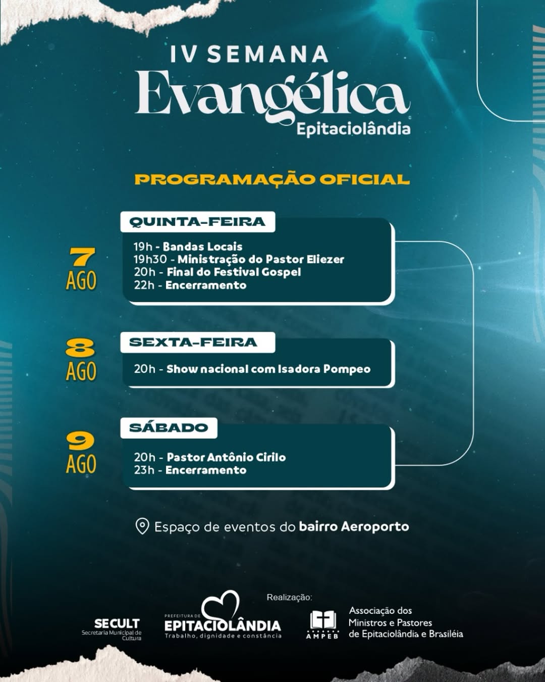 A cidade de Epitaciolândia se prepara para viver momentos de fé, adoração e comunhão com a realização da IV Semana Evangélica, que acontecerá nos dias 7, 8 e 9 de agosto, no espaço de eventos do bairro Aeroporto. O evento é promovido pela Prefeitura de Epitaciolândia, por meio da Secretaria Municipal de Cultura (SECULT), em parceria com a Associação dos Ministros e Pastores de Epitaciolândia e Brasiléia (AMPEB).