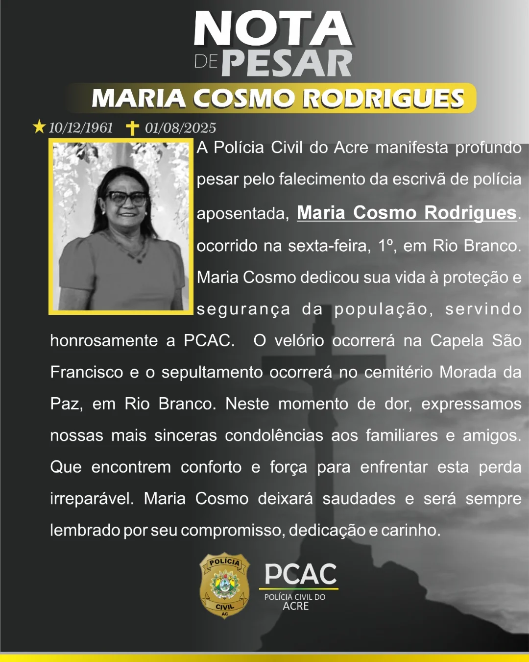 A Polícia Civil do Acre (PCAC) comunicou, com pesar, o falecimento da escrivã de polícia aposentada Maria Cosmo Rodrigues, ocorrido na sexta-feira (1), em Rio Branco.