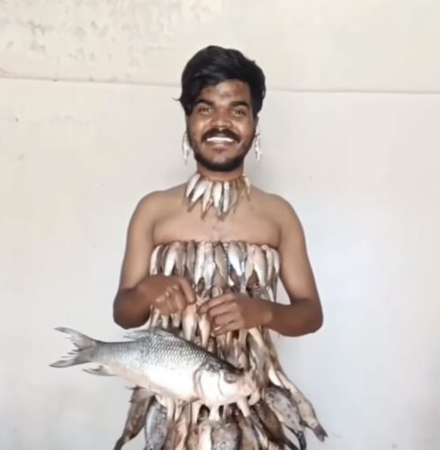Um vídeo inusitado tem circulado nas redes sociais e gerado grande repercussão. Nas imagens, o influenciador digital Nenavath Tharun aparece vestido com um traje confeccionado totalmente com peixes. O visual inclui vestido, bolsa, colar e até brincos feitos do mesmo material.