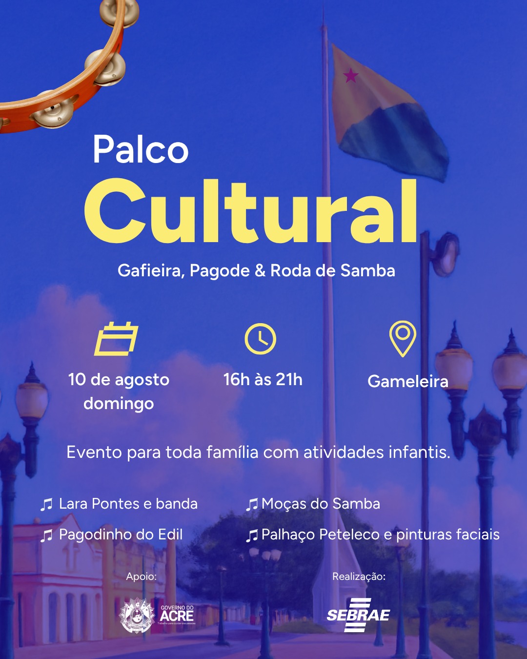 O próximo domingo, 10 de agosto, será de celebração e cultura na Gameleira, em Rio Branco. O local será palco de mais uma edição do Palco Cultural, evento que reúne gafieira, pagode e roda de samba em uma programação especial para todas as idades.