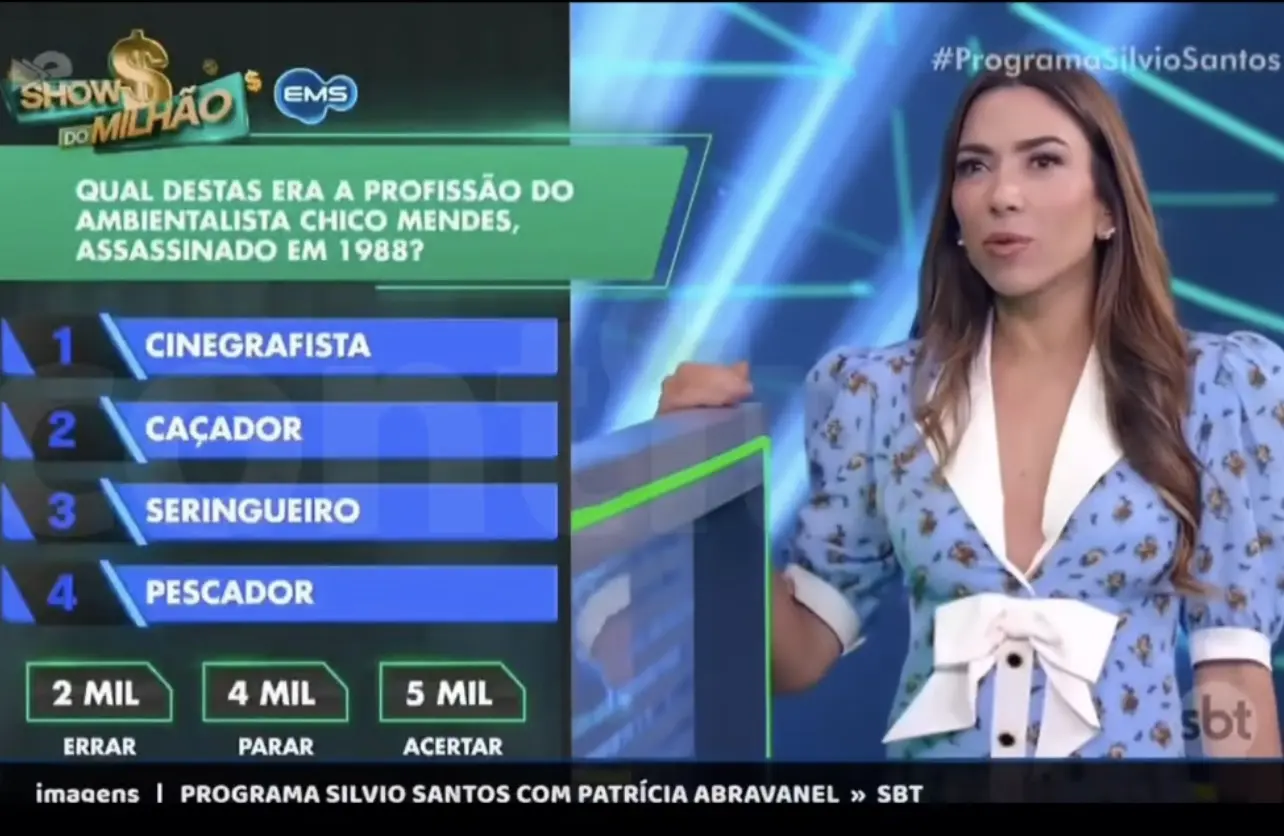 A questão valia R$ 5 mil e foi lida por Patrícia Abravanel: “Qual era a profissão do ambientalista Chico Mendes, assassinado em 1988?” As opções apresentadas foram: