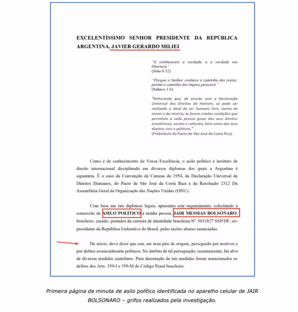 A PF encontrou no smartphone de Bolsonaro um arquivo editável sem data e assinatura em que é pedido asilo político em regime de urgência para Bolsonaro.