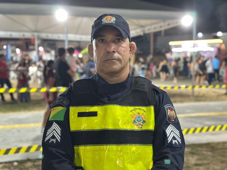 PolĂcia Militar reforça segurança na Ășltima noite do Festival da Farinha em Cruzeiro do Sul. Foto: ContilNet