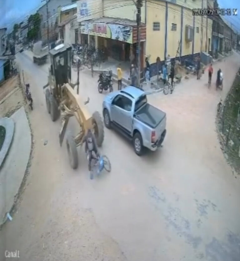 Um ciclista escapou por muito pouco de ser atropelado por uma motoniveladora na tarde desta segunda-feira (25), em Tarauacá. O incidente foi registrado por uma câmera de segurança instalada na rua João de Paiva, em frente ao Comercial Juan, no bairro da Praia.