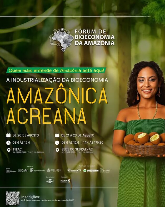 O Sebrae no Acre realiza, entre os dias 20 e 23 de agosto, o Fórum de Bioeconomia da Amazônia. O evento será em Rio Branco e vai reunir especialistas e lideranças nacionais e internacionais para debater e fortalecer a industrialização da bioeconomia amazônica.