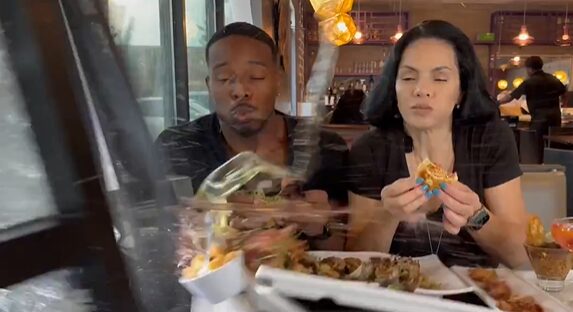 No vídeo, é possível ver os influenciadores experimentando pratos em um restaurante, enquanto interagem com a câmera. De repente, um veículo aparece em alta velocidade e colide direto na mesa em que eles estão.