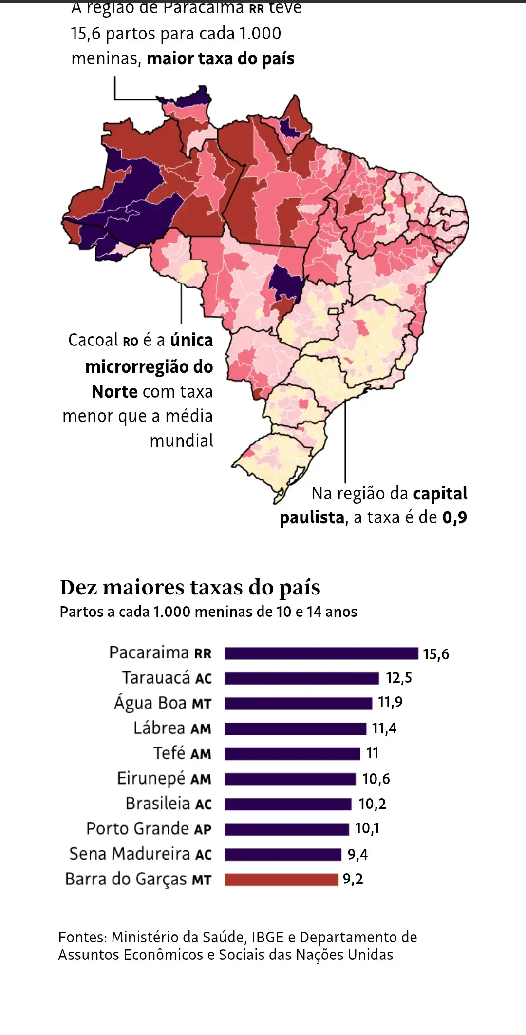 O cenário mais preocupante é o de Tarauacá, que ocupa o 2º lugar no ranking nacional, com taxa de 12,5 gestações para cada mil meninas de 10 a 14 anos — ficando atrás apenas de Pacaraima, em Roraima, que registra 15,6. Brasileia aparece na 7ª posição, com índice de 10,2, e Sena Madureira surge na 9ª colocação, com 9,4.