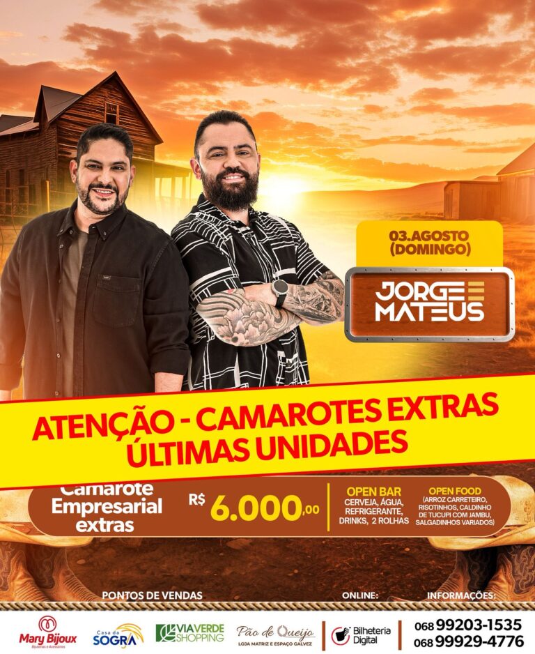 A contagem regressiva começou! Faltam apenas 24 horas para o encerramento do segundo lote dos ingressos Premium (R$600) e Camarote Empresarial (R$6.000) para o tão esperado show de Jorge & Mateus, que acontece durante a Expoacre 2025 – edição comemorativa de 50 anos.