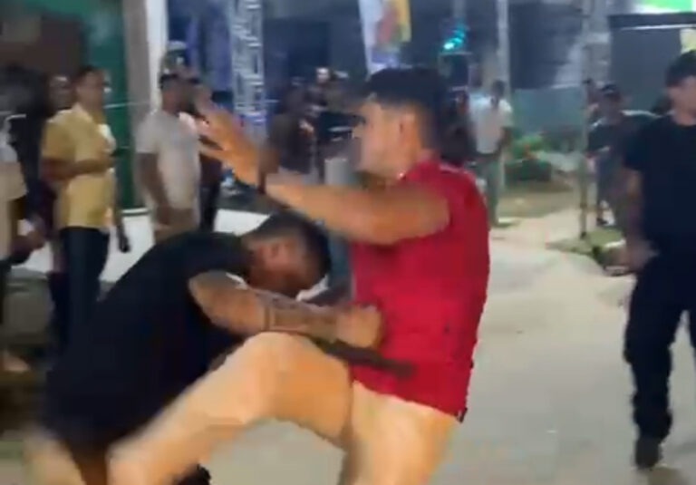 Nas imagens, Ă© possĂvel ver um grupo de seguranças imobilizando um homem. Em seguida, outro indivĂduo se aproxima e tenta intervir, iniciando uma troca de empurrĂ”es, chutes e socos com os profissionais de segurança. A situação evoluiu para um confronto fĂsico, enquanto outras pessoas observam e registram a cena com celulares.