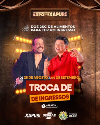A organização da ExpoXapuri 2025 anunciou um formato solidário para a entrada nos grandes shows e no rodeio deste ano. Para garantir o acesso, o público deverá doar 2 kg de alimentos não perecíveis, com exceção de sal, açúcar e macarrão instantâneo.