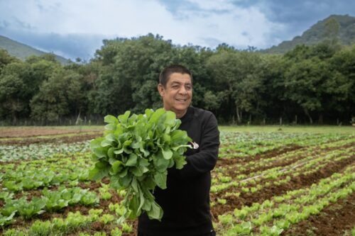 De sandália e meia nos pés, ele caminha pela terra molhada e até prova algumas folhas de rúcula em seu novo quintal, a Horta Urbana Xerém I, que alimentará famílias na região que escolheu como refúgio.