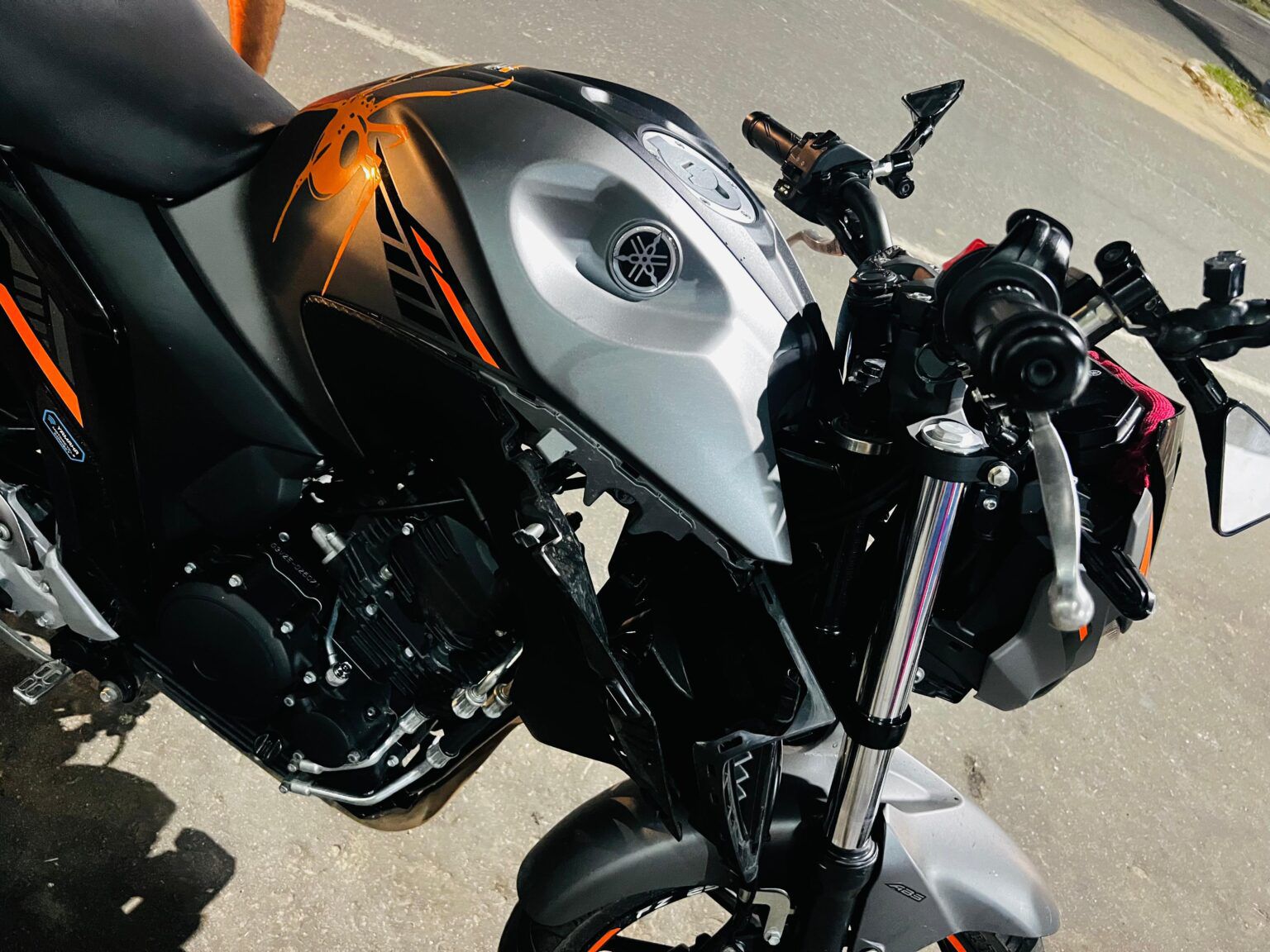 O veículo VW/Gol teve a porta lateral esquerda amassada, enquanto a motocicleta apresentou avarias na lateral próxima ao tanque de combustível, além de ranhuras na descarga.