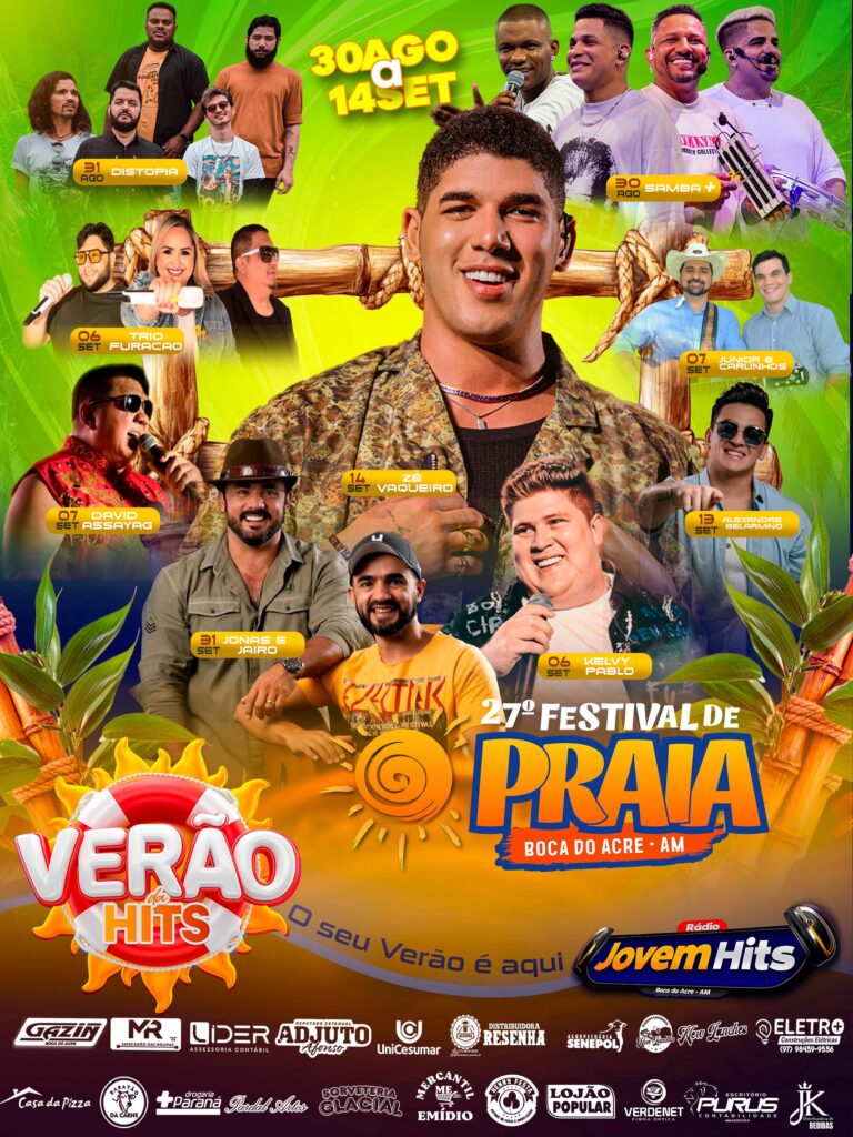 Começou no último dia 30 de agosto e segue até 14 de setembro o 27º Festival de Praia de Boca do Acre, que todos os anos reúne alegria, cultura e música à beira do rio. A programação está imperdível, com grandes artistas levando animação ao público.