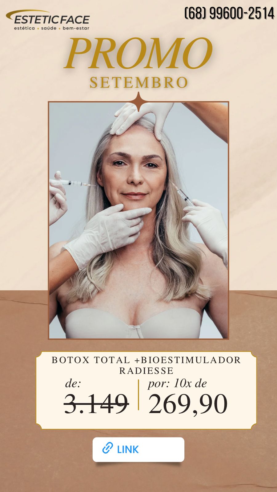 A clínica Estetic Face preparou uma oferta imperdível para este mês de setembro. O combo Botox total + Bioestimulador Radiesse está de R$ 3.149,00 por apenas 10x de R$ 269,90. Uma oportunidade para quem deseja cuidar da beleza e autoestima com qualidade e preço especial.
